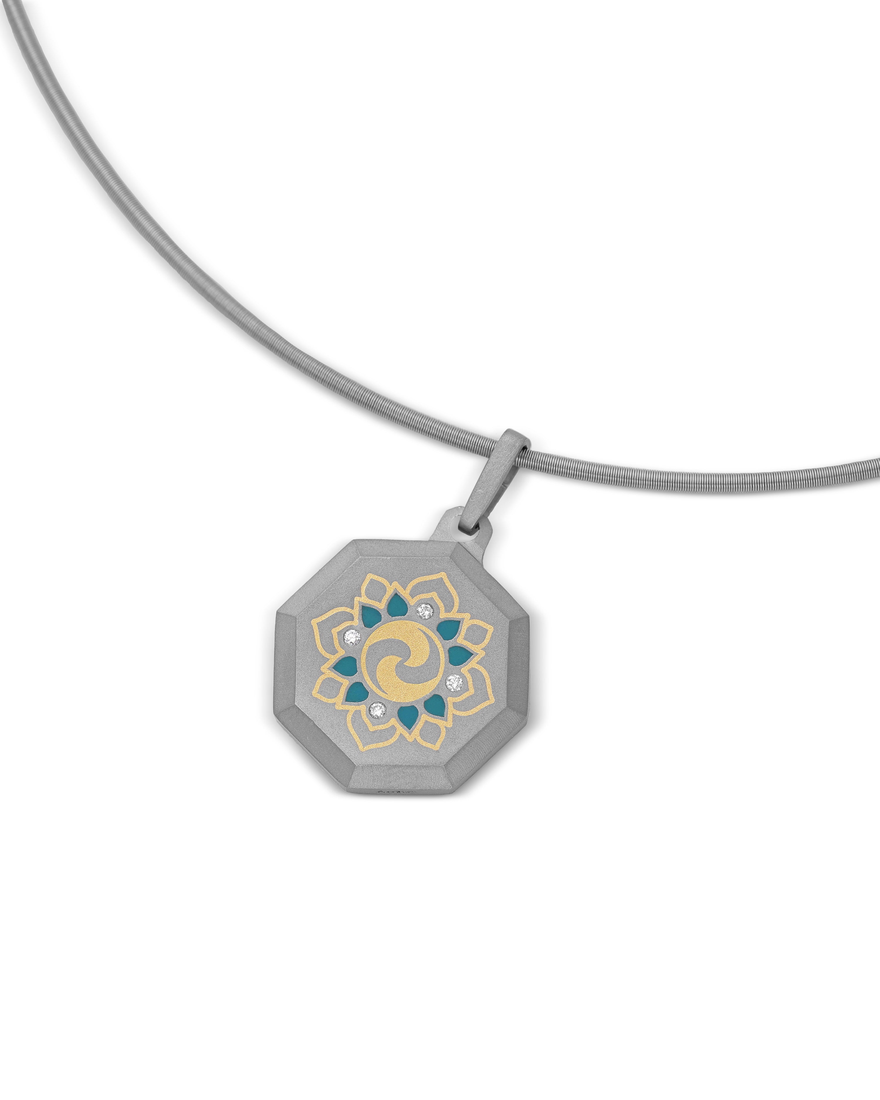 The Ashtanga Pendant is a powerful symbol of balance and transcendence rooted in ancient wisdom. Crafted in Aerospace-grade Titanium and inlaid with 22K ReBorn Gold and ReBorn Natural Diamonds, this pendant reflects the eightfold path of purpose, consciousness, and spiritual alignment.