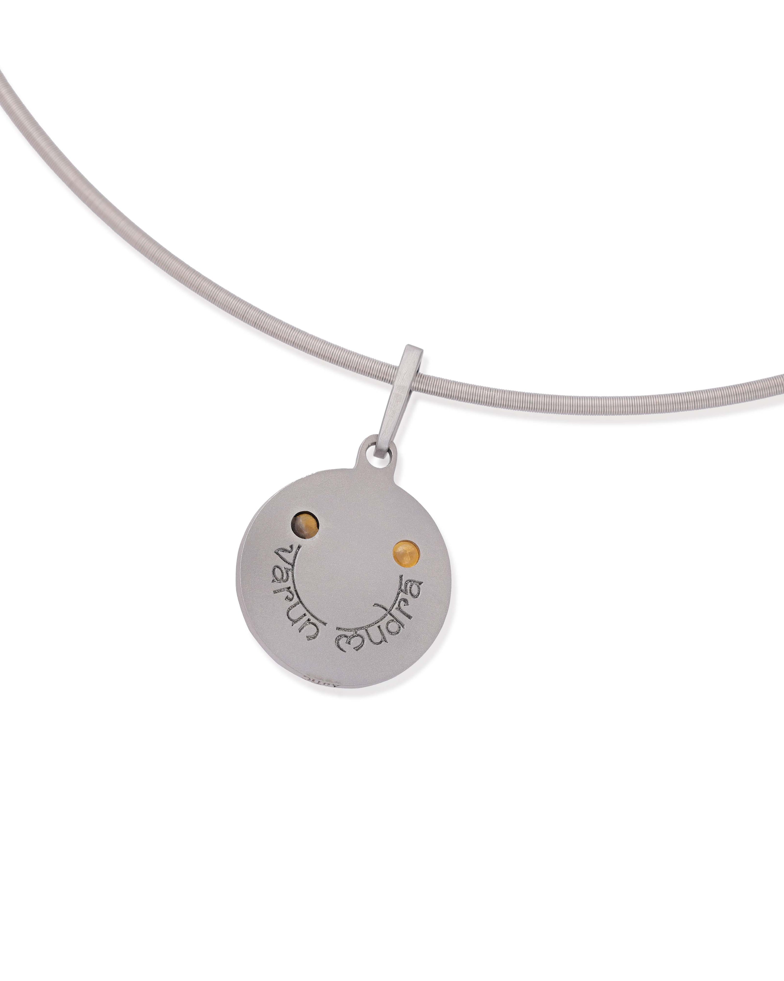 The Varun Pendant flows with creative and emotional energy. Linked to the sacral chakra, its fluid design and warm-hued stones encourage sensuality, intuition, and free movement, balanced by titanium’s calm strength