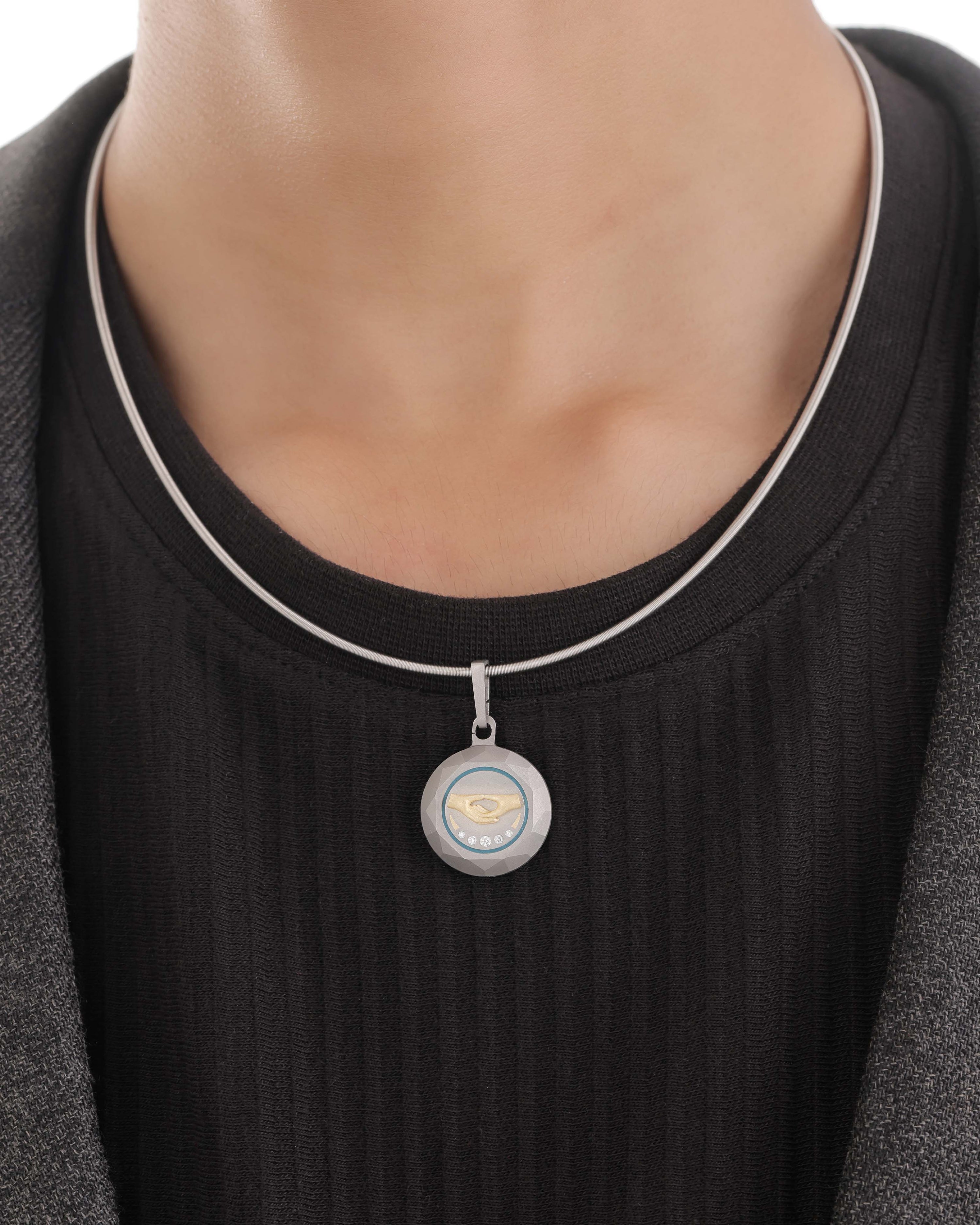 The Dhyana Pendant channels the energy of stillness and elevated consciousness. Crafted in aerospace-grade titanium and accented with gold and diamonds, it reflects the meditative power of the crown chakra, bringing clarity, calm, and deep spiritual connection.