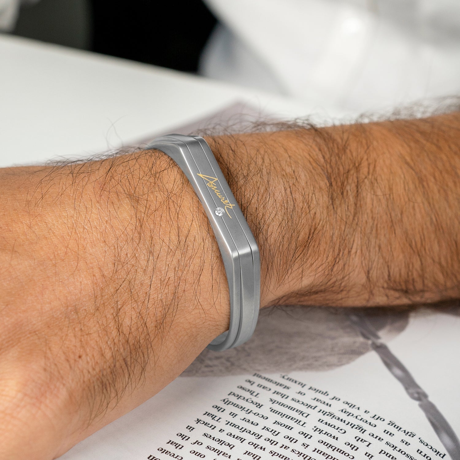 Bold, minimalist, and deeply personal. This titanium bracelet is forged for strength, inlaid with gold, and finished with your chosen signature. A timeless accessory that transforms into a story of yours.