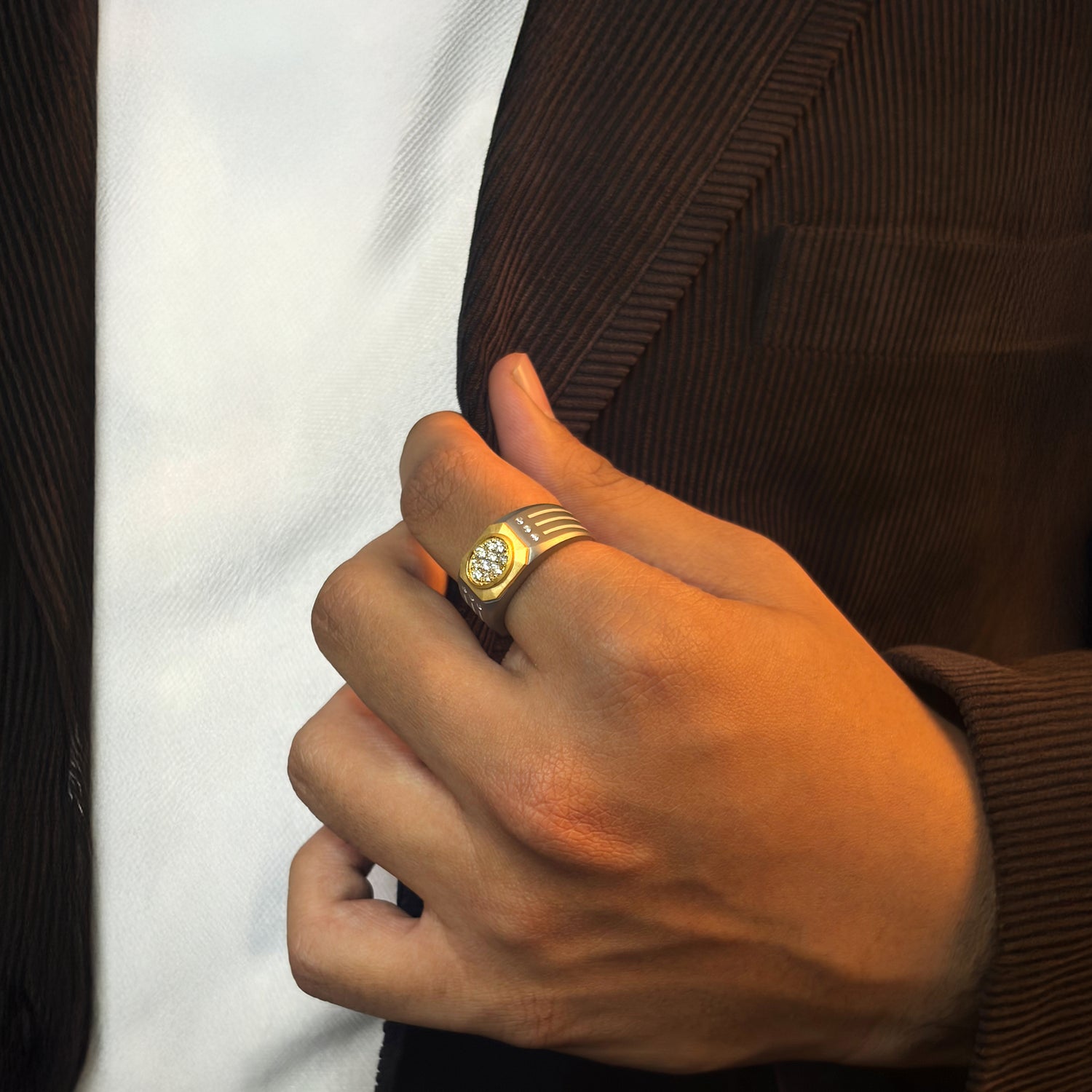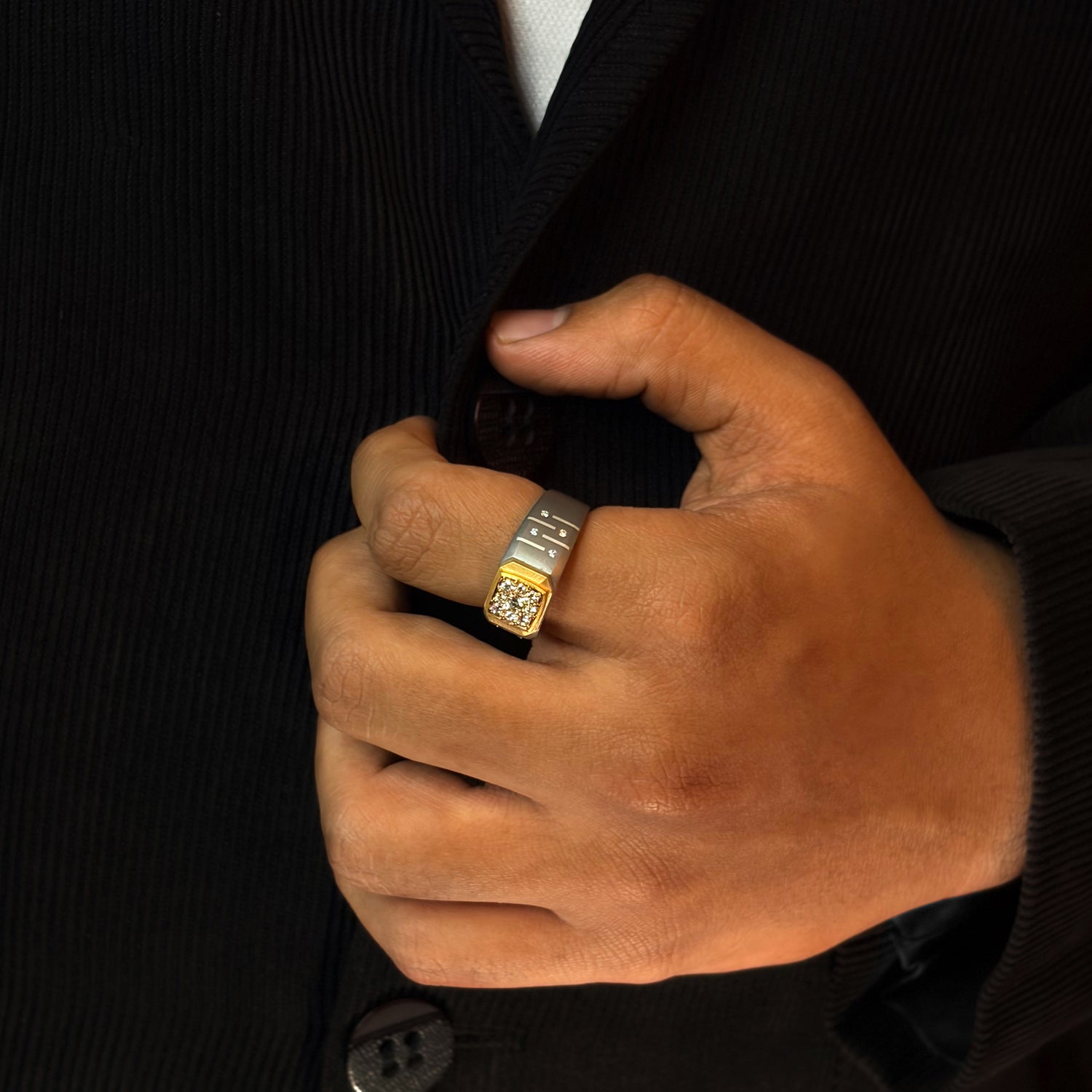 Axiom Axis is structured around a clear central focus. A gold framed natural diamond cluster anchors the design, while linear detailing adds depth and direction. Crafted from Aerospace grade Titanium, the ring balances precision, durability, and restraint, making it suited for daily wear without reliance on excess.