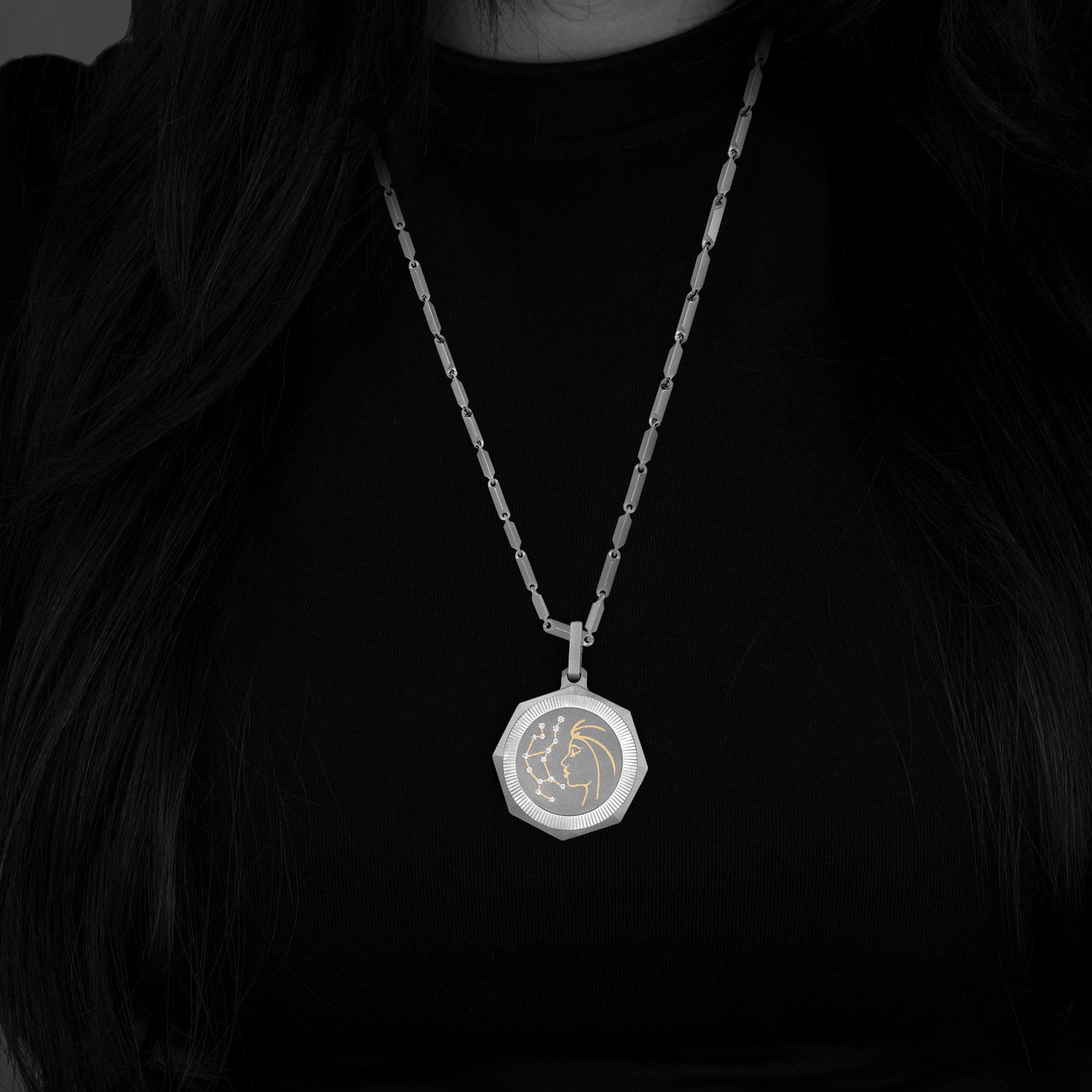A tribute to Virgo’s clarity and grace, this pendant is crafted in Titanium with gold inlay, faceted mother of pearl, and Lab grown diamonds that mirror their quiet strength.