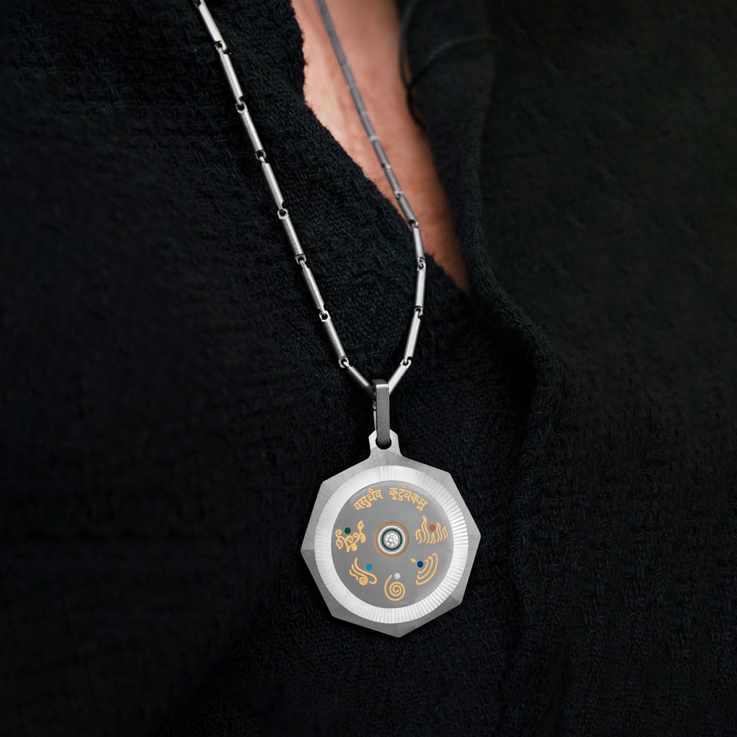 Inspired by this timeless Indian ideal, the Vasudha Pendant is a powerful symbol of unity, balance, and shared existence. The Pendant pays tribute to the Panchtattva Earth, Water, Fire, Air, and Space, harmonized in a form that celebrates our place within a universal family.