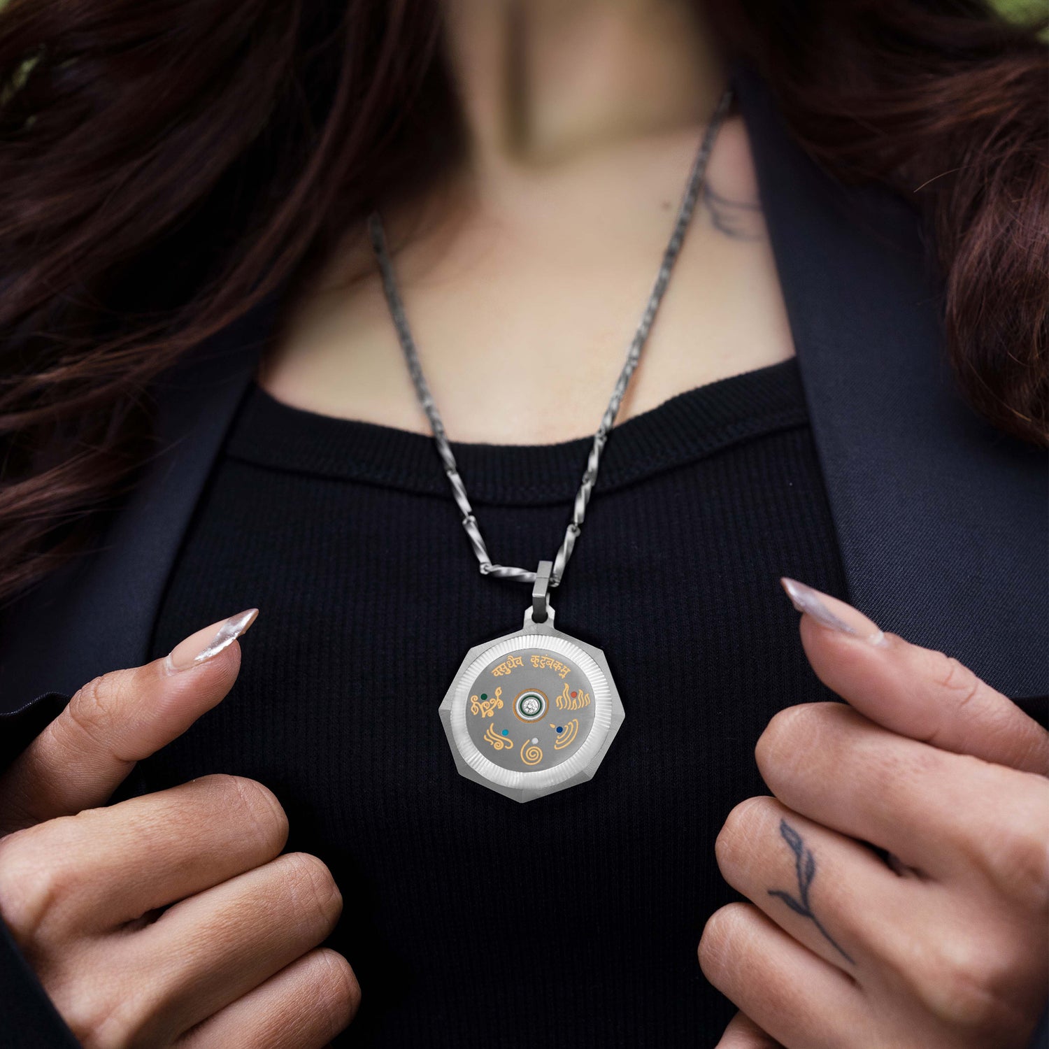 The Vasudha Pendant speaks to those who believe in luxury with purpose. Whether worn as a daily token or a ceremonial piece, it is a constant reminder that we are interconnected rooted to the earth, breathing the same air, warmed by the same fire, flowing like water, and held by the vastness of space.