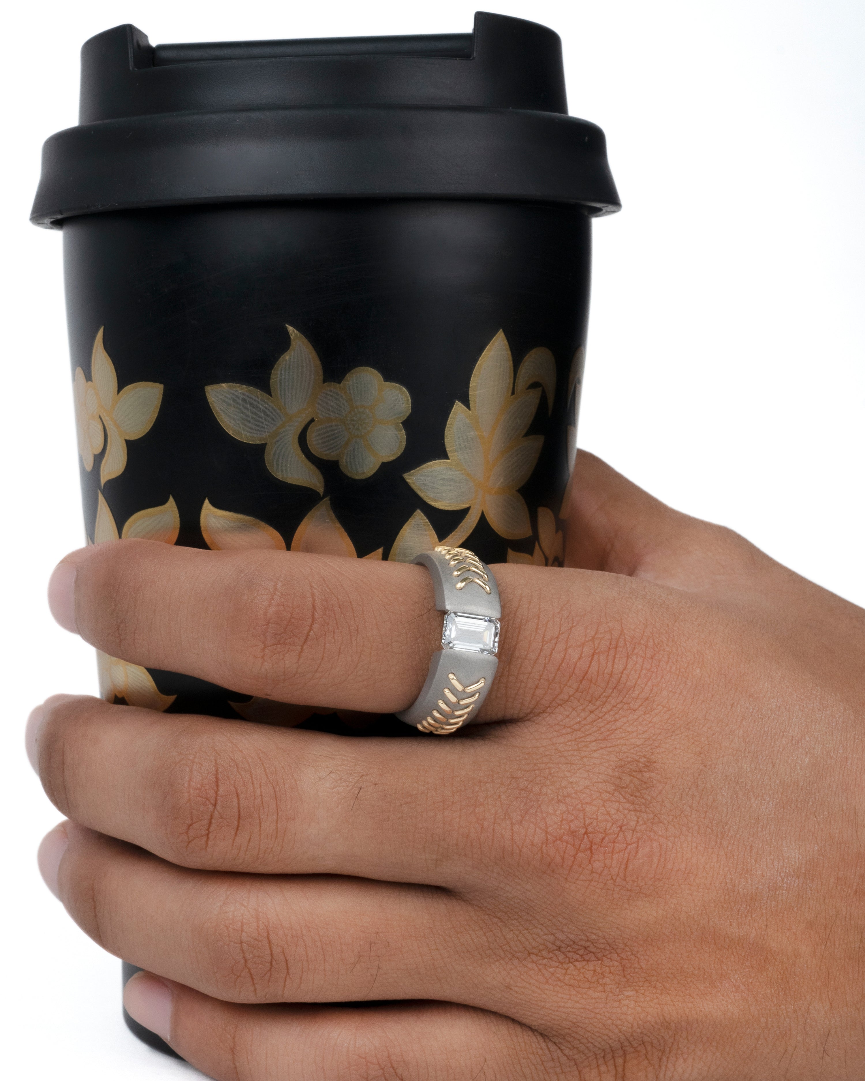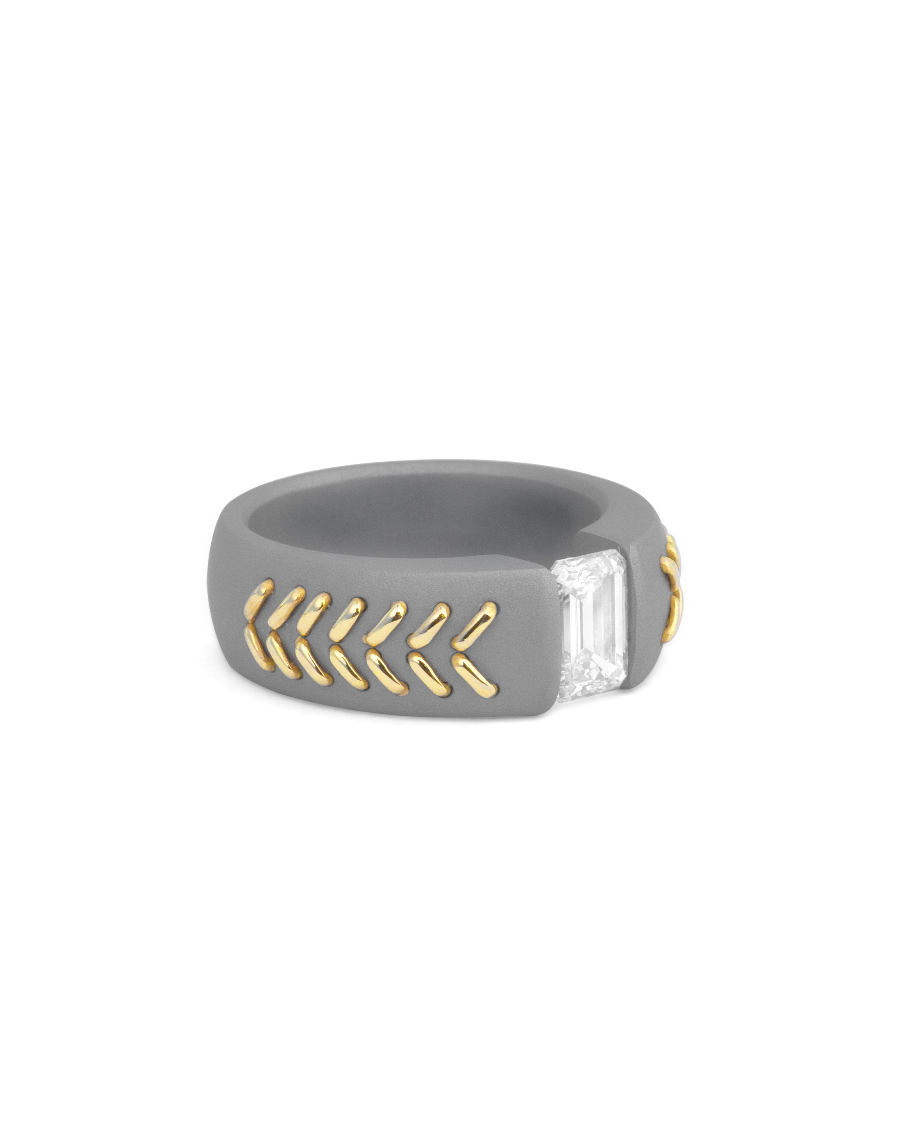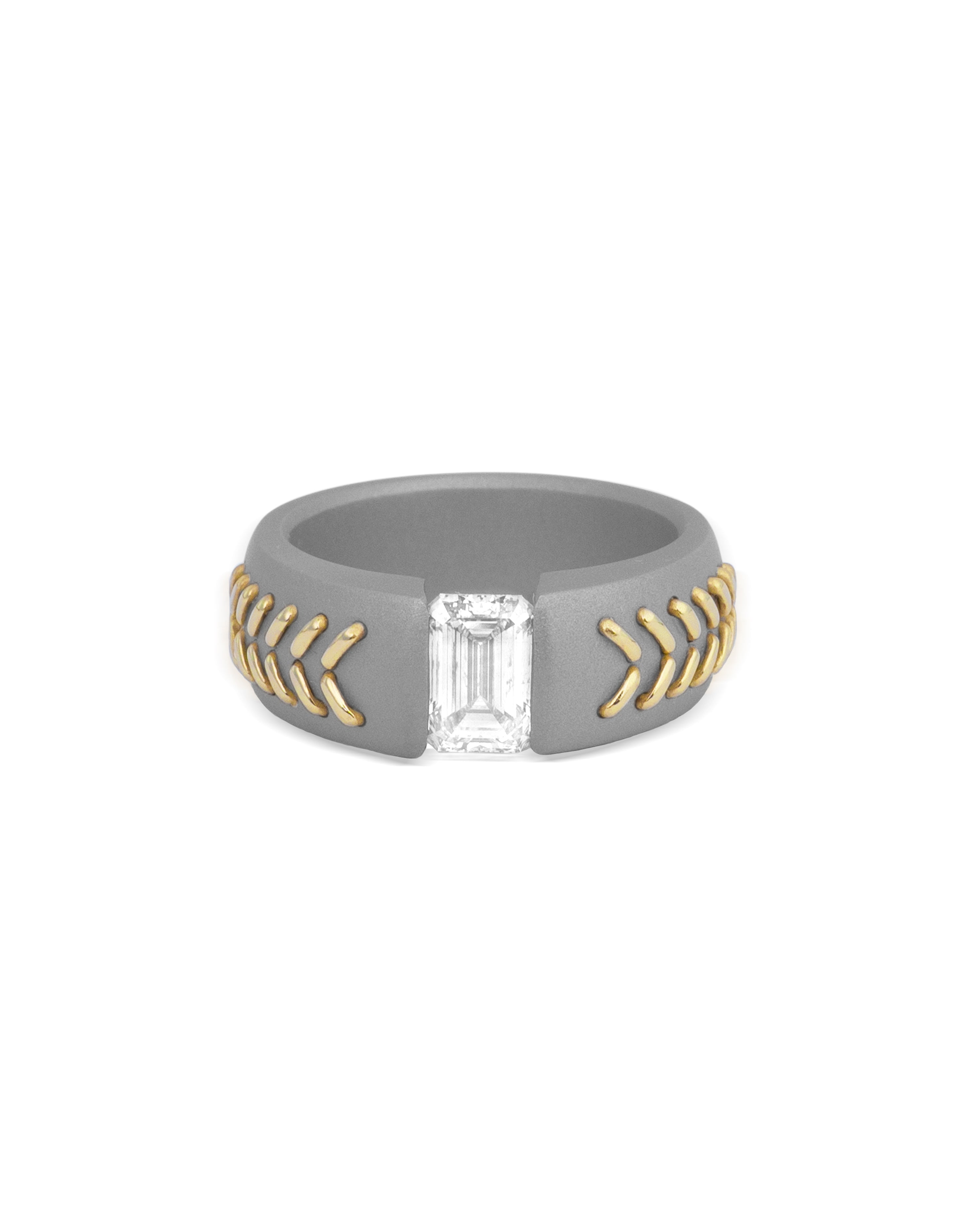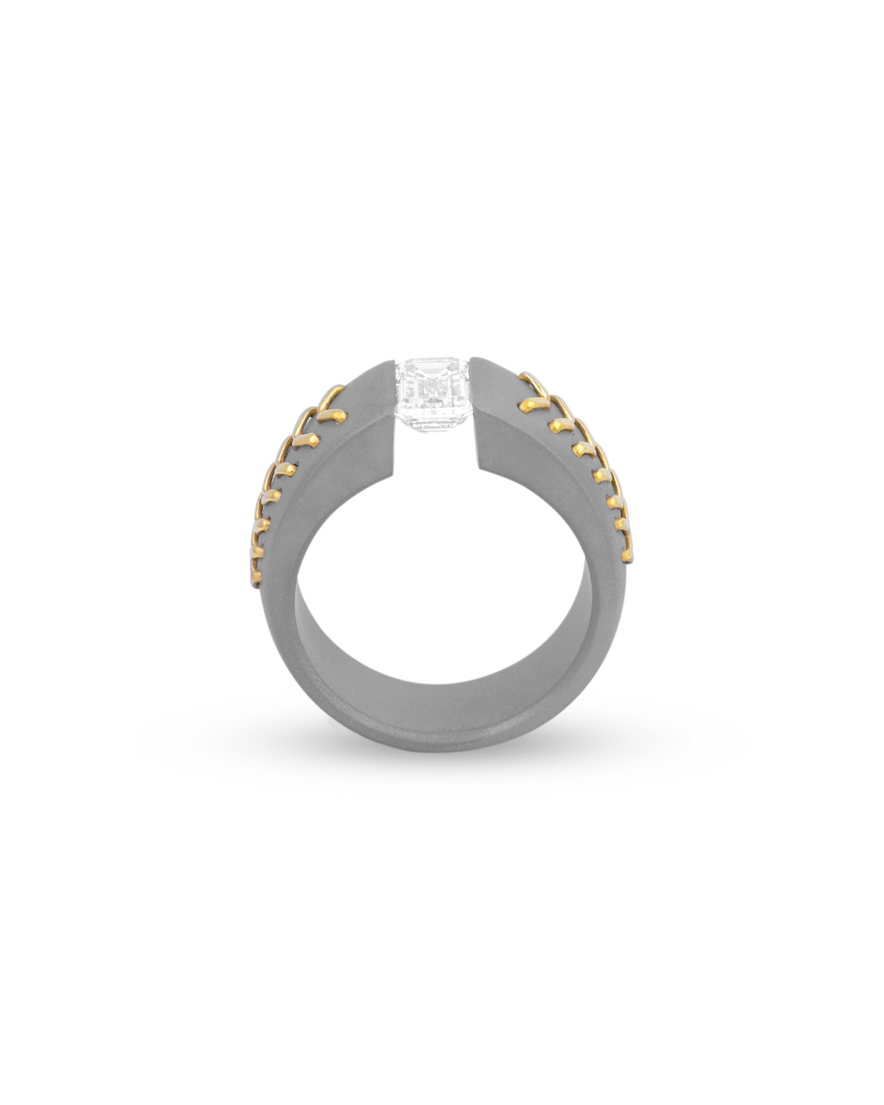 Experience the ultimate expression of masculinity with our exquisite creation, crafted from aerospace grade titanium, recycled gold, and lab-grown diamonds. Featuring a tension setting, it securely holds a stunning emerald diamond at its center. Our Arcane rings are designed for the modern man, this piece offers unmatched durability and a sleek, contemporary look.