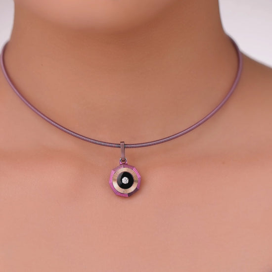 Discover understated luxury with our mauve titanium pendant, crafted from aerospace-grade titanium, recycled gold and lab grown diamonds. The soft mauve hue offers a delicate, modern twist on our classic Aura design.